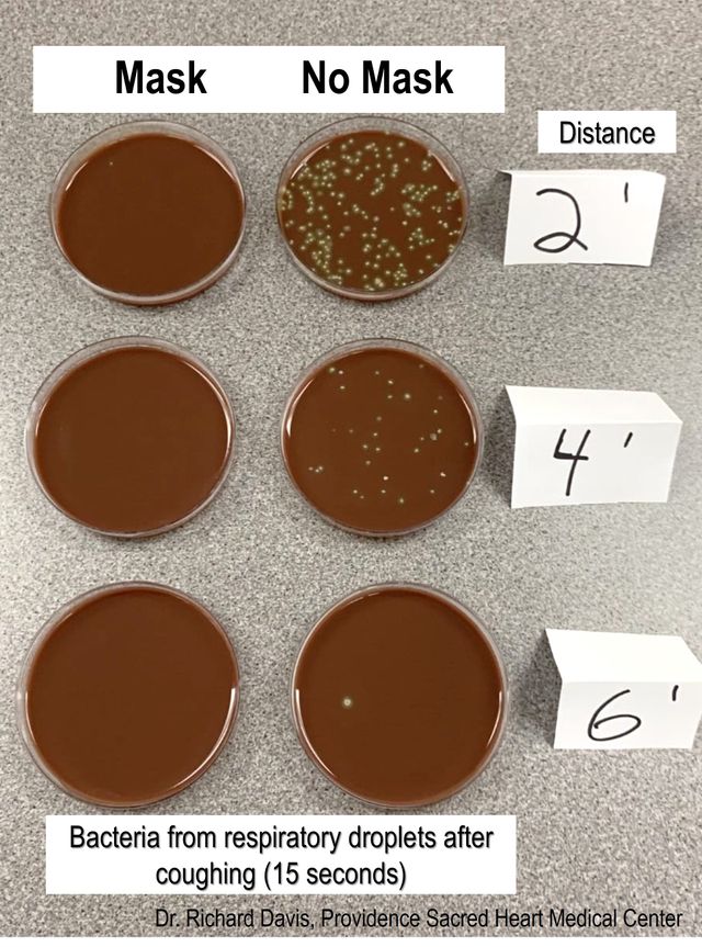 Спеціально для тих, кому "маска не допомагає", учений Річ Девіс провів кілька демонстрацій з чашками Петрі, показавши, яке велике значення мають маски для зупинки розповсюдження крапель слини.