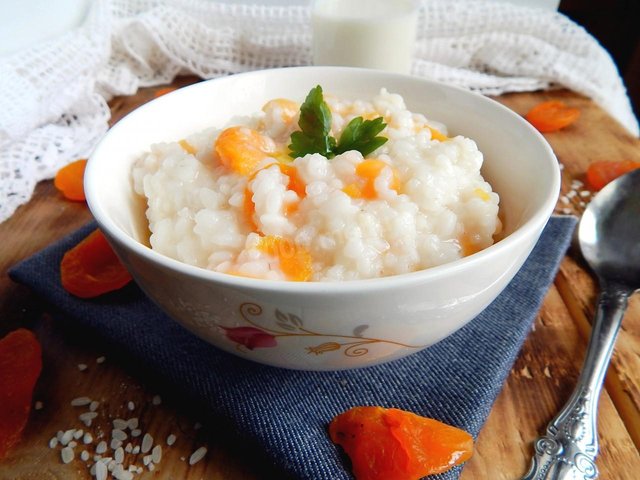 Закип'ятити воду або молоко в каструлі. Потримати курагу в окропі кілька хвилин, нарізати маленькими шматочками. Рис промити та всипати в каструлю, варити 5 хвилин на великому вогні, потім зменшити вогонь, накрити кришкою, варити до готовності. Додати курагу і цедру, зняти з вогню, трохи остудити. Розкласти по тарілках, полити соком апельсина.
