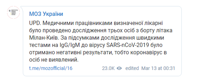 У Міністерстві охорони здоров'я повідомили, що за підсумками дослідження швидкими тестами, коронавірус у трьох госпіталізованих невиявлений.