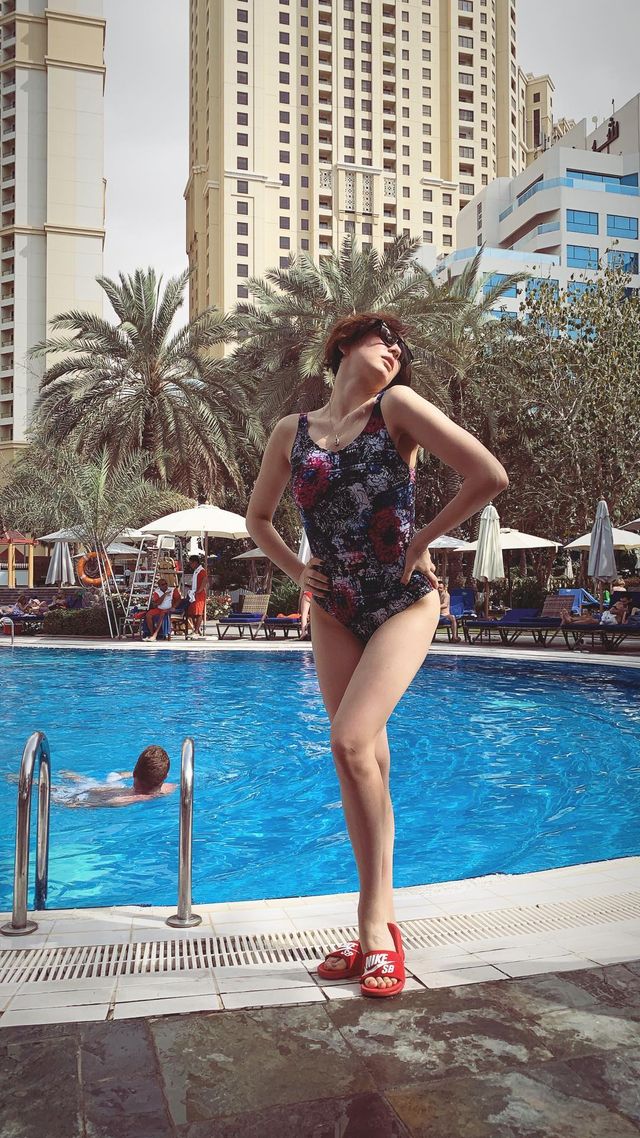Однак зірка не забуває радувати своїх шанувальників спокусливими кадрами. Так, красуня опублікувала знімок, на якому вона грайливо позує в купальнику на тлі басейну, демонструючи підтягнуту фігуру.