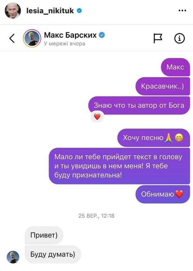 Невідомі розмістили в Історіях скріншоти з листувань Лесі зі поп-виконавцем Максом Барських, де вона просить його створити для неї пісню: