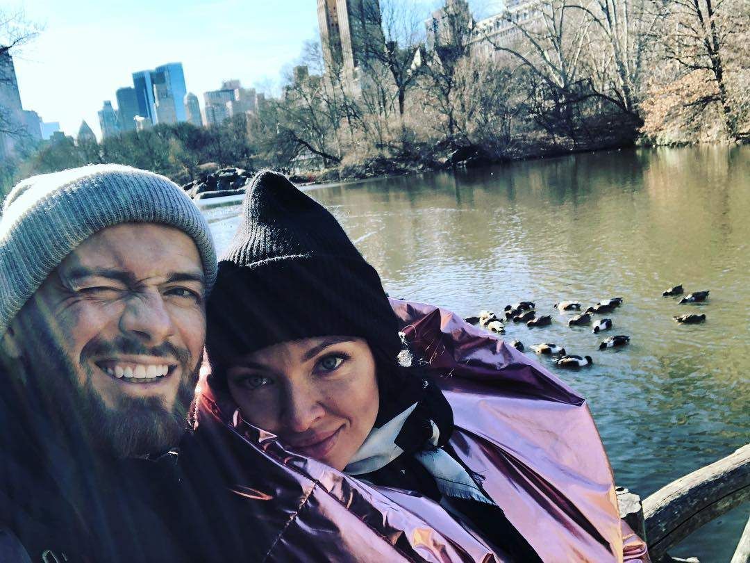 На знімку парочка позує в теплому одязі на прогулянці у всесвітньо відомому нью-йоркському Центральному парку. Мабуть, в цьому американському місті холодно, як і в Києві, оскільки танцюрист і його дружина одягнені в куртки і шапки. А ось снігу там не видно.