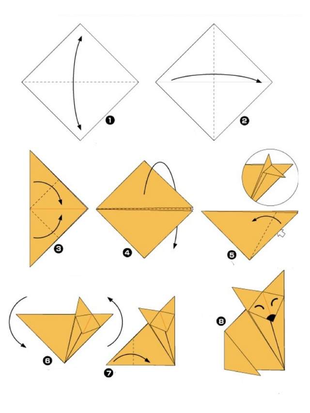 Така лисиця з паперу під силу навіть малюкам. Наступні схеми будуть складнішими: тим цікавіше з ними повозитися. Нам знадобиться квадратний аркуш паперу відповідного кольору. Можна зробити з білого офісного паперу, а потім розфарбувати свого звірятка або довірити це дітям. Далі складайте папір поетапно: