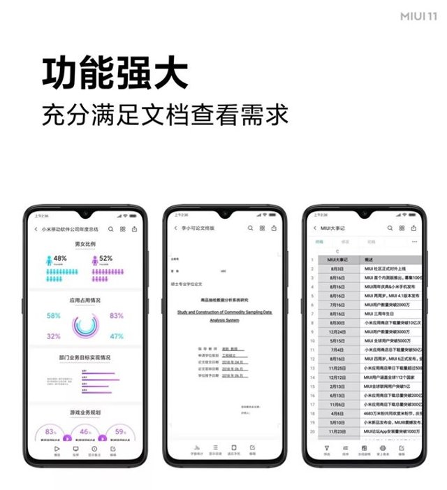 Додаток Mi Work дозволяє відкривати різні текстові документи, презентації та таблиці. Він показує мініатюри самих файлів з коротким описом їх вмісту для спрощення навігації серед великого числа файлів.
