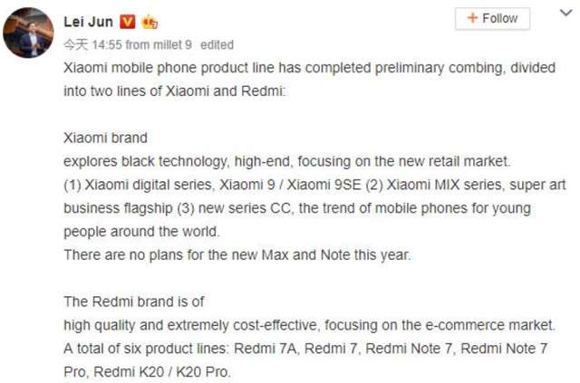 За словами Лея Цзюня, у рамках бренду Xiaomi вони націлені на випуск топових смартфонів, зробивши акцент на офлайн-продажах через роздрібні магазини. Актуальними залишаються апарати серії Mi9, Mi Mix і прийдешні моделі CC. Він також підкреслив, що цьогоріч фанатам точно не варто чекати на нові моделі гігантського Mi Max і флагманського Mi Note.