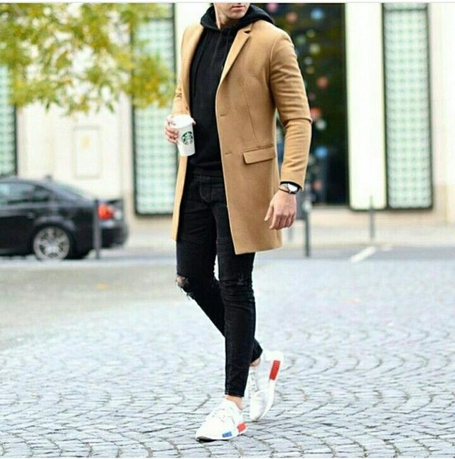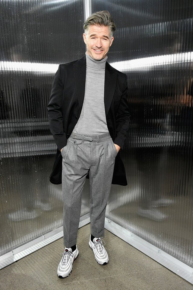 Сіре довге пальто і чорні вовняні штани – must have речі в арсеналі джентльменів з почуттям стилю. Створити красивий контраст з іншими елементами цього лука допоможуть білі кросівки.