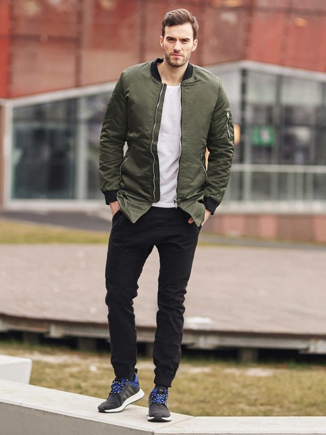 Оливковий бомбер і чорні джинси – необхідні елементи в гардеробі чоловіків з відмінним смаком в одязі. Любителі ризикованих поєднань можуть закінчити лук чорними кросівками.
