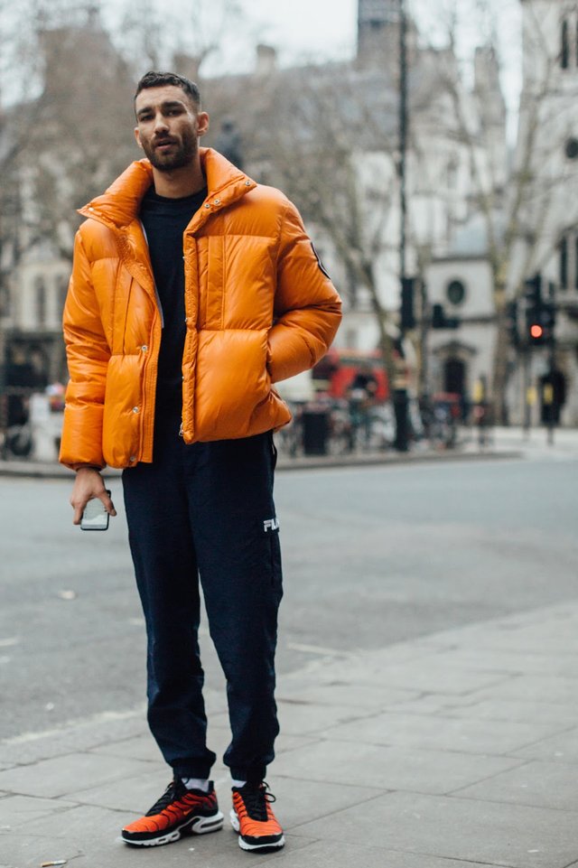 Помаранчева куртка-пуховик в парі з темно-синіми спортивними штанами – чудова ідея для створення чоловічого лука в стилі елегантної повсякденності. Пара помаранчевих кросівок додасть образу невимушеності.