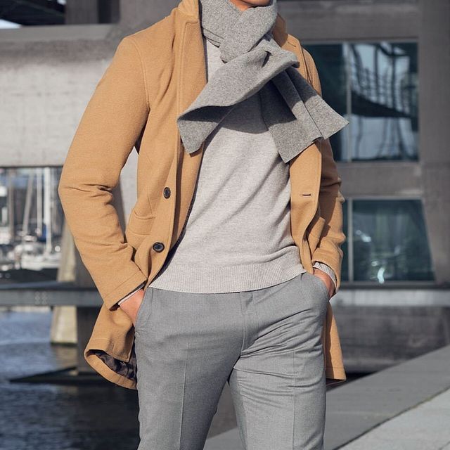 Попри те, що цей лук досить класичний, поєднання світло-коричневого довгого пальта і сірих класичних штанів завжди буде вибором стильних молодих людей, який неминуче підкорить при цьому серця дівчат. У холодну пору такий образ можна чудово доповнити теплим аксесуаром – шарфом. Його можна зав'язати у вузол – так буде і стильно, і тепло.