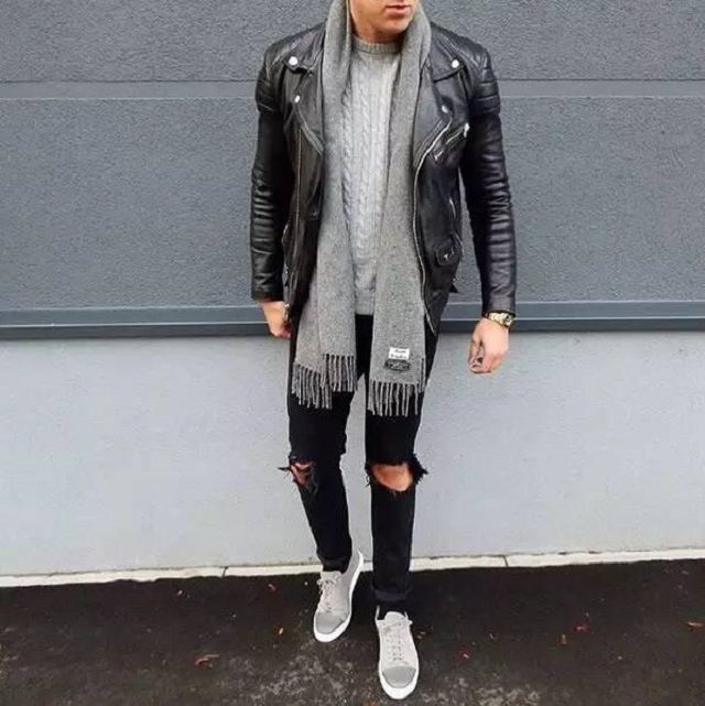 Якщо ти цінуєш зручність і практичність, чорна шкіряна косуха і чорні порвані джинси – хороший вибір для привабливого чоловічого образу на кожен день. Хотів би зробити лук трохи цікавішим? Тоді як доповнення до цього ансамблю, зверни увагу на сірий або ж чорний шарф. Відмінно підійде як і звичайний шарф, так і шарф-хомут.