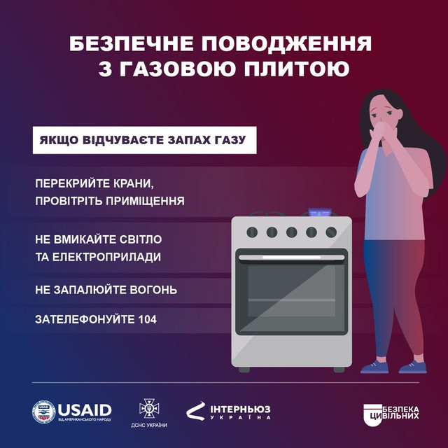 Якщо ви відчуваєте запах газу, негайно перекрийте йому доступ, провітріть приміщення, не запалюйте вогонь, не вмикайте і не вимикайте електроосвітлення та прилади. Зателефонуйте 104, пише ДСНС.