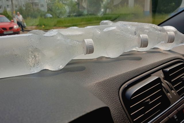 Інший спосіб – взяти з собою в машину лід в пляшках або пакетах. Цей метод не настільки дієвий, оскільки охолоджувати він буде тільки невеликий простір навколо себе, а закріпити його перед на панелі не так просто. Найдієвіший варіант цього способу – покласти пару заморожених пляшок під лобове скло, прямо на поздовжні повітроводи. Але пам'ятай, що, впавши звідти, пляшка може опинитися під педаллю гальма, а це дуже небезпечно.