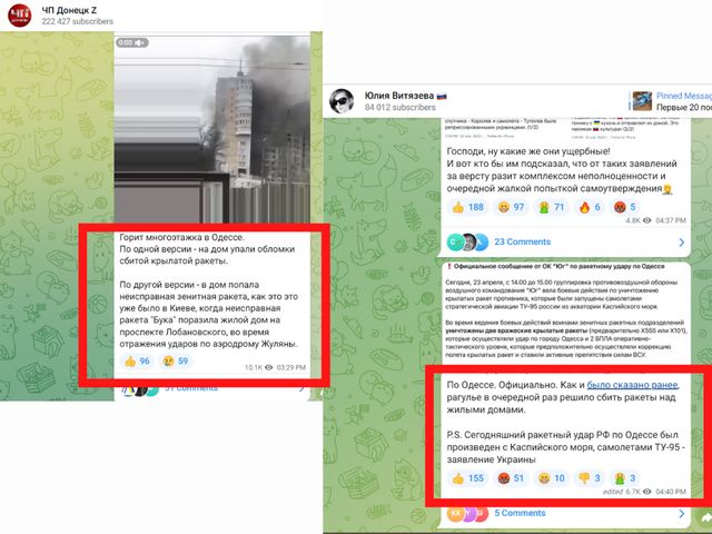 Кадри з місця трагедії, якими поділились в Одеській міській раді, вказують, що ціллю був саме будинок, а руйнування спричинило не збиття ракети силами ППО. Звісно ж, після цього кремлівські телеграм-канали почали змінювати свою позицію у дописах.