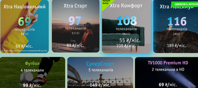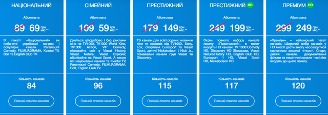 Мінімальна акційна вартість телевізійних пакетів – 55-69 гривень, а максимальна – 149-299 гривень на місяць.