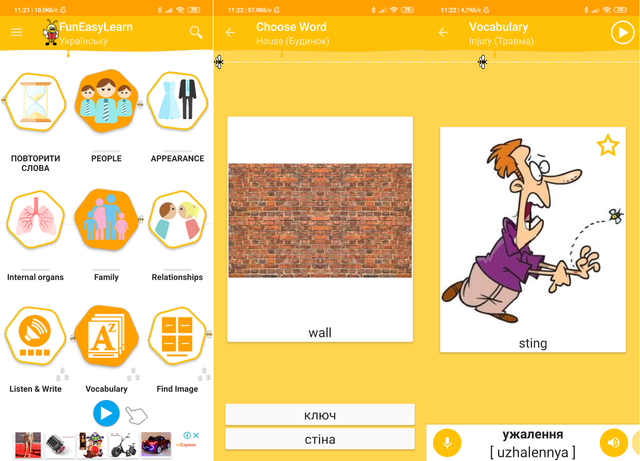 Ще один додаток, який дозволяє вивчити українську мову. Принцип дії той самий: вказуємо рідну мову та приступаємо до вивчення. Втім, дизайн програми цікавіший і підійде для тих, хто не хоче використовувати просто софт, який візуально нагадуватиме таблицю з підручника. Можна вивчати не лише слова, а й вправлятися з занотовування їх на слух. Єдине, що може вам не сподобатися – наявність реклами, яка вимикається за окрему плату. Також можна "докупити" більшу кількість слів. Власне, перша тисяча – безкоштовна.