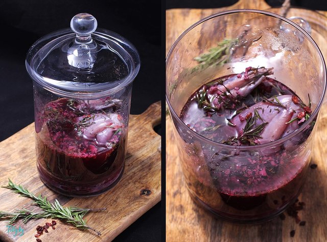 Інгредієнти для приготування маринаду з соєвим соусом на тушку кролика: 200 мілілітрів білого сухого вина, 50 мілілітрів соєвого соусу, 200 мілілітрів води, дві щіпки розмарину, дві щіпки паприки, перець. Маринувати м'ясо треба мінімум дві години.