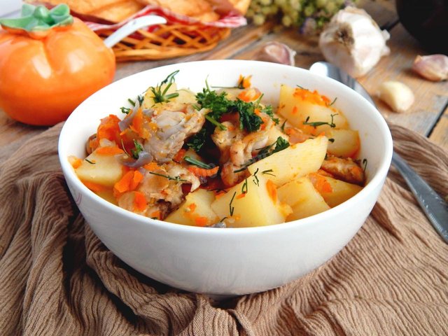 - Мясо кролика помити, порізати на порційні шматки, промокнути паперовим рушником. Посолити і поперчити кролика. Картоплю нарізати великими шматочками, на чотири частини. Цибулю – тонкими півкільцями. Моркву нарізати кружечками або півкругами.