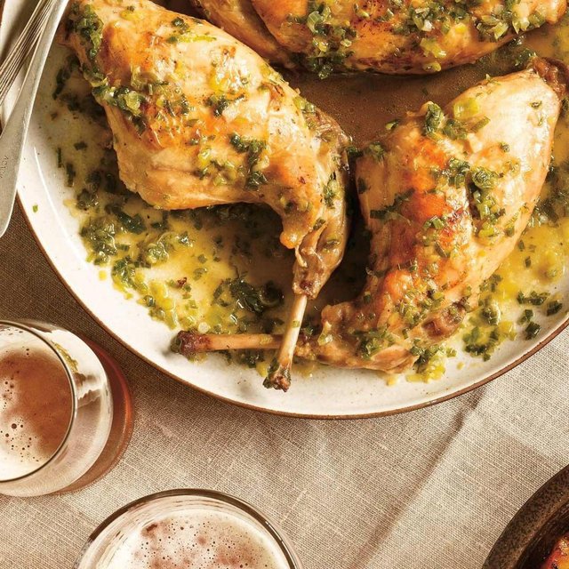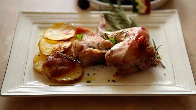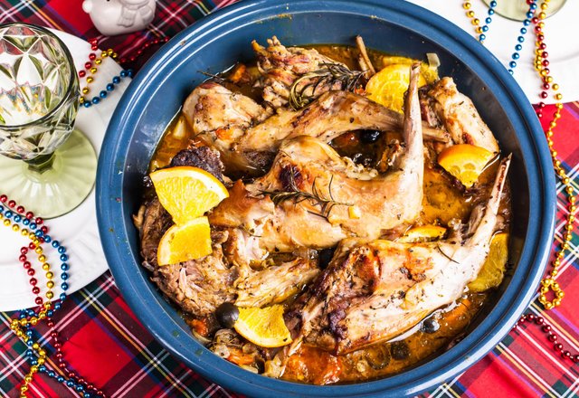 - Вміст сковороди кип'ятіть 6-7 хвилин до утворення сиропу. Вийміть розмарин з соусу і з м'яса. Наріжте м'ясо поперек волокон, шматочками по 2,5 см. Викладайте на кожну тарілку 1 ніжку і 2 шматочки кролятини, кілька оливок, цибулю. Полийте соусом. Прикрасьте часточкою апельсина.