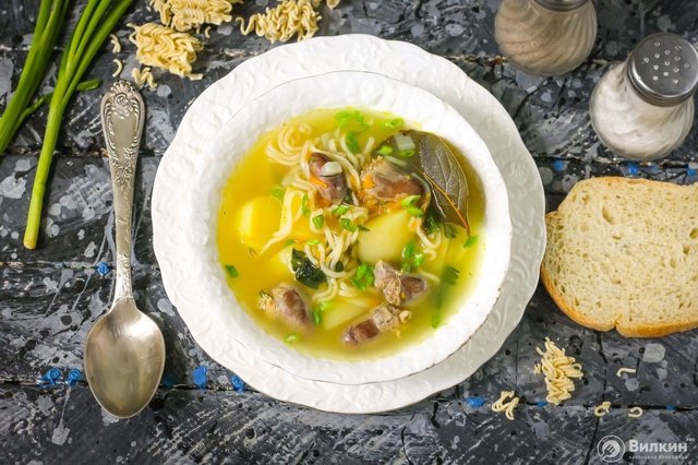 - Картоплю очистити, вимити, нарізати кубиками. У киплячий бульйон покласти картоплю, варити 7 хвилин. Додати макарони, пасеровані овочі, лавровий лист, сіль і перець, варити до готовності (5-10 хвилин).
