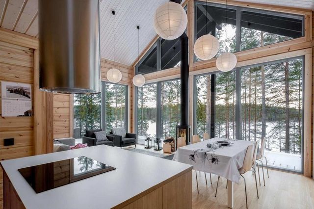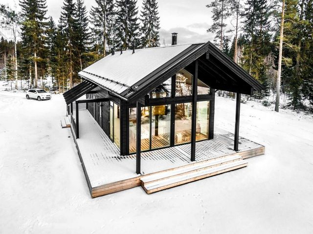 Вілла, площа якої складає 100 квадратних метрів, створена з ламінованих дерев'яних колод завдяки вмілим архітекторам Pluspuu. Кожна колода має товщину у 202 мм та сучасні кутові з'єднання. Одна стіна повністю складається з віком, з яких відривається краєвид прямісінько на озеро. Попри зовнішню легкість, помешкання може витримати найсуворішу зиму до -30 градусів! До слова, джерелом обігрівання є геотермальне тепло зі свердловини. Ось такий еко-дім, з усім необхідним для життя: