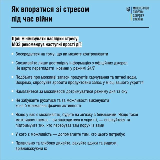 Пам'ятайте, що відчувати тривогу, занепокоєння та страх у той час, коли навколо вас бойові дії, а країна в стані війни з агресором, – нормально. Це прийнятна реакція вашої психіки й організму на ситуацію, що склалася, – наголошують у МОЗ.