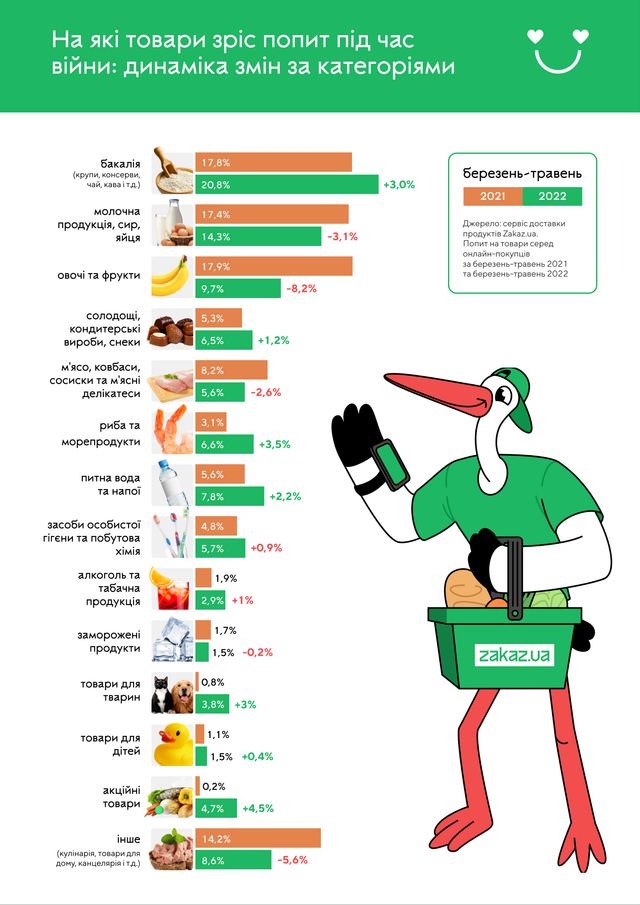 Натомість менше почали купувати овочі та фрукти. Цьогоріч на них припадає 8,2% замовлень. Натомість торік ця цифра сягала 9,7%. Також на 5,6% упав попит на продукцію з кулінарії.