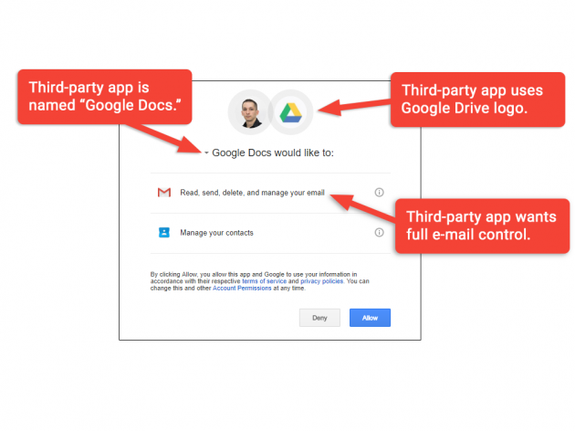 Користувачі без усякого побоювання переходили за посиланням, щоб ознайомитися з документом. Ось тут зловмисники підготували для них фішинговий додаток, який просив повний доступ до електронної пошти. Ця програма була замаскована під Google Drive: мала таку ж іконку і назву.