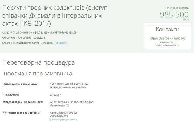Відповідні дані з'явилися на сайті держзакупівель "Прозоро". Так, виступ переможниці Євробачення-2016 Джамали обійдеться у майже мільйон гривень.