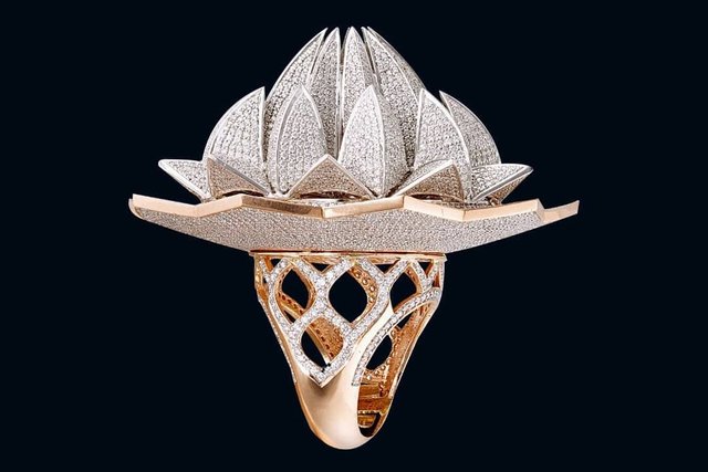 Дизайн персні було розроблено Bhandari, засновником ювелірної компанії Lakshikaa Jewels, і повторює він Храм Лотоса в Делі.