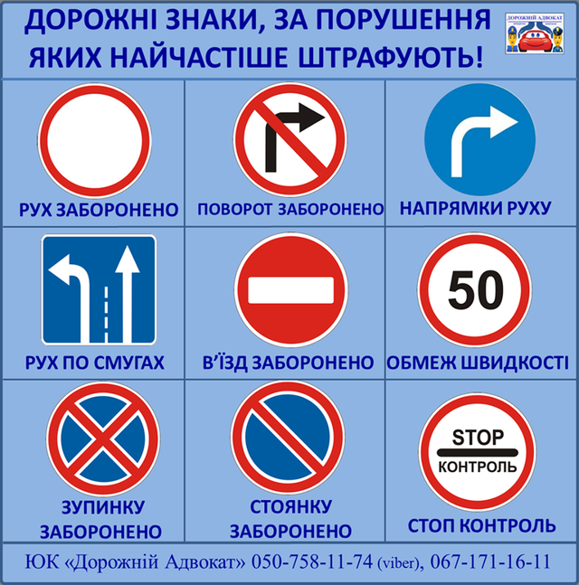Юридична компанія "Дорожній Адвокат" підготувала корисну та завжди актуальну для українських автомобілістів інфографіку. На ній вказані знаки, за які найчастіше штрафують водіїв на дорогах України. Відповідна картинка була опублікована на сторінці фірми у Facebook.