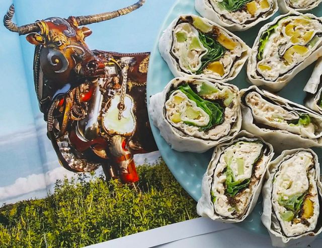 - На лаваш наносимо пензликом майонез, потім основну масу, зверху лист норі. Зверху – листя салату.