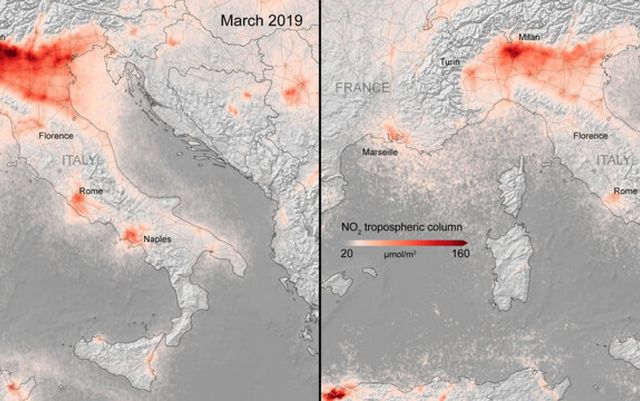 Дані із супутників показують викиди діоксиду азоту (NO2) над Францією в березні 2019 на одному кадрі і з 14 по 25 березня 2020 року на іншому. Густий червоний колір вказує на високий рівень забруднення. Зазначається, що рівень забруднення впав не тільки в Парижі, але і в Мілані та Мадриді.