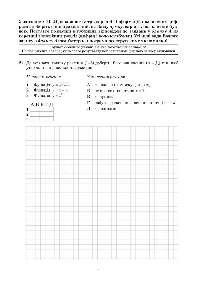 - Завдання 21-24 – це завдання на встановлення відповідності "логічні пари". Оцінюється в 1 бал – за кожну правильно встановлену відповідність. Максимум – 3 бали.