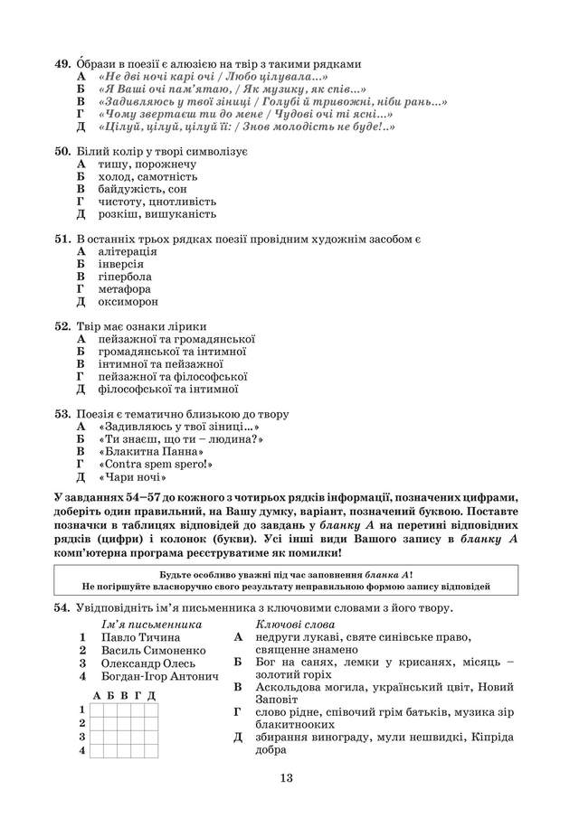 Сертифікаційна робота з української мови і літератури налічує 58 завдань різних форм і складається з трьох частин: "Українська мова" – 33 завдання, "Українська література" – 24 завдання, і "Власне висловлення" – одне завдання відкритої форми з розгорнутою відповіддю.