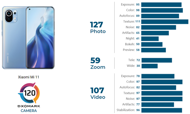 За результатами усіх тестів камера Xiaomi Mi11 отримала 120 балів. Це нижче, ніж у багатьох флагманів 2020 та навіть 2019 року. Для порівняння, Mi11 Ultra, що посідає сьогодні перше місце, набрав 143 бали.