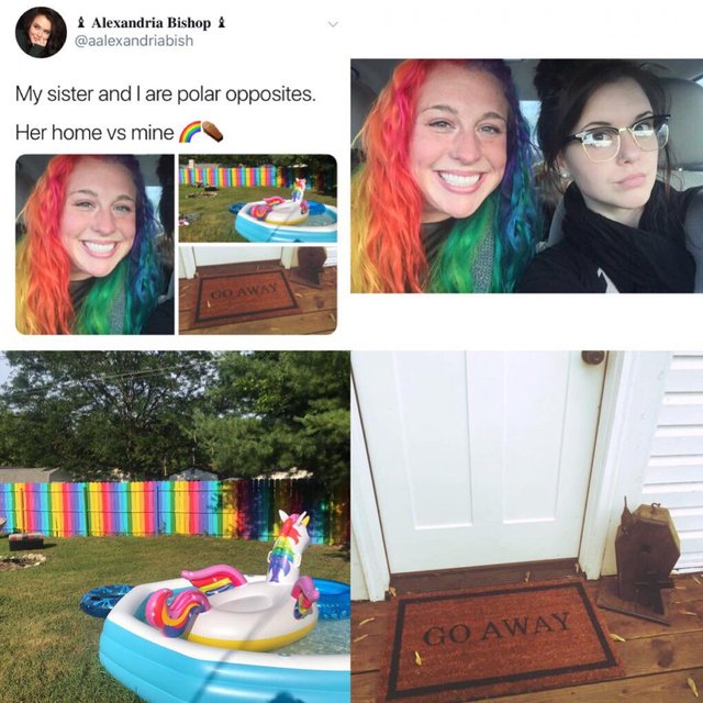 На платформі Reddit користувач з ніком _succubabe поділився епічним колажем, який набирає популярності в мережі. Річ у тому, що на кадрах можна побачити двох дівчат, яких важко назвати ріднею, однак вони сестри. За короткий час допис зібрав понад 48 тисяч переглядів та більш як тисячу коментарів. І це не дивно, адже поки одна сестра з веселковим волоссям обожнює все яскраве та ділиться радістю з оточенням, інша - доволі похмура та не у захваті від надмірної уваги. Користувачі ж намагаються уявити, що було б зі спільним помешканням цих двох, яких охрестили Сквідвардом та Губкою Бобом.